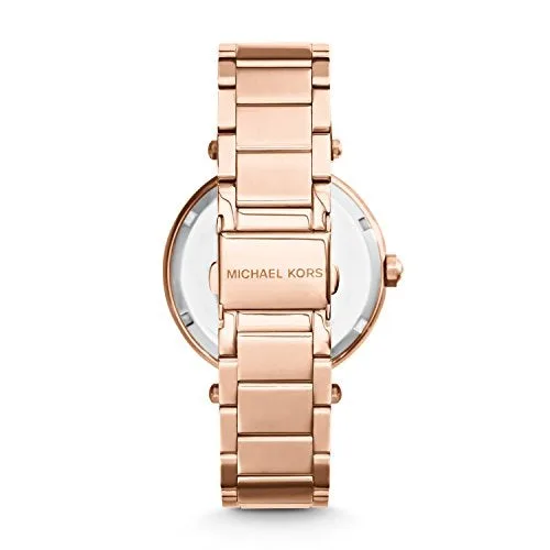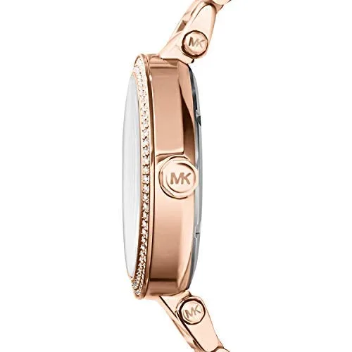 Einzelheiten: Diese Damenuhr Parker verstrmt Glamour pur. Das Pav-Zifferblatt mit MK-Logo wird von einer Glitz-Lünette eingerahmt und das Band besteht aus einem Mix aus rosgoldfarbenem Edelstahl und rosafarbenem Acetat.