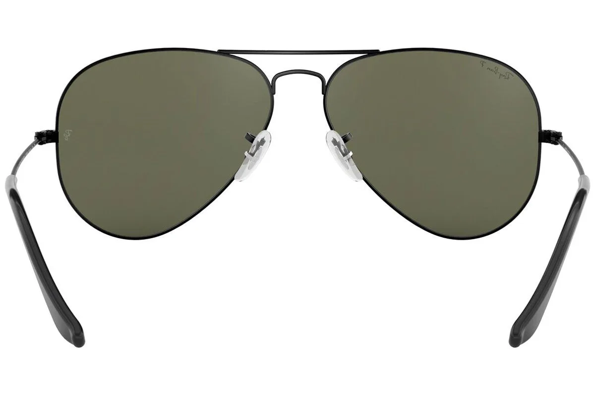 Der klassische und zeitlos stylische Ray-Ban Aviator, dieser Unisex-Style  hat einen schwarzen Rahmen und schlanke schwarze Bügel mit schwarzen Ohrensocken. Die Gläser sind kristallgrün mit polarisiertem Finish und tragen das Ray-Ban-Logo.