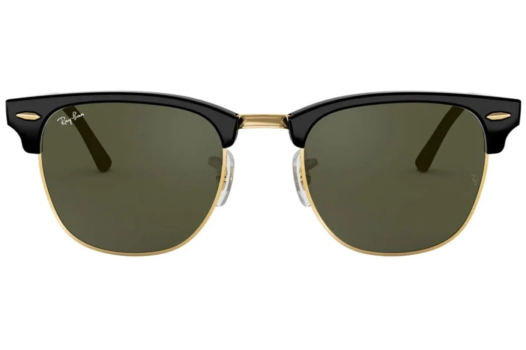 Dieses hochmodische Unisex-Modell ist eine überarbeitete Version des klassischen Clubmaster und verfügt über einen tiefschwarzen Acetat-Oberrahmen und tiefschwarze Bügel, die auch das Ray Ban-Logo tragen. Der untere Bereich der Fassung und der Steg sind mit Golddraht versehen und die Gläser sind grün getönt und tragen auch das Markenlogo.
